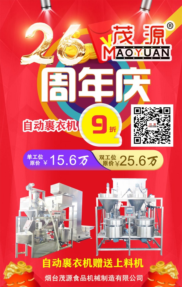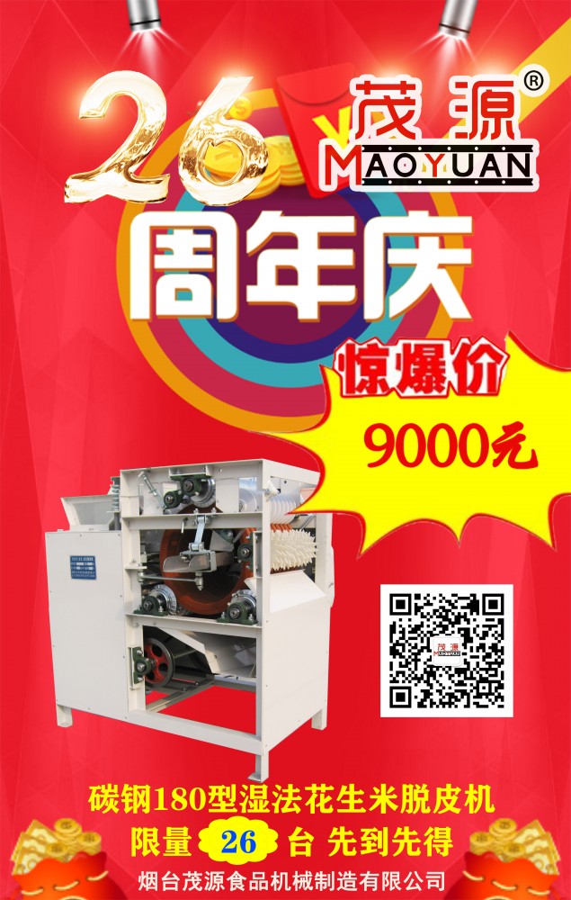 煙臺(tái)茂源食品機(jī)械即將迎來26周年慶,為感謝新老客戶長期以來的支持與信任,現(xiàn)特推出以下感恩回饋活動(dòng):單工位、雙工位自動(dòng)裹衣機(jī)原價(jià)15.6萬元、25.6萬元基礎(chǔ)上降價(jià)10%,并隨機(jī)贈(zèng)上料機(jī);碳鋼180型濕法花生米脫皮機(jī)特價(jià)9000元,限量26臺(tái),先到先得!